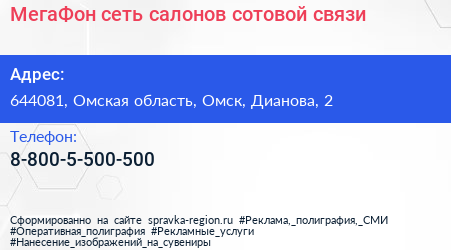 МегаФон, сеть салонов сотовой связи по адресу 644081, Омская область, Омск, Дианова, 2 в дальнейшем Организация, размещена в следующих категориях: