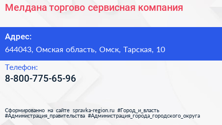 Мелдана, торгово-сервисная компания по адресу 644043, Омская область, Омск, Тарская, 10 в дальнейшем Организация, размещена в следующих категориях:
