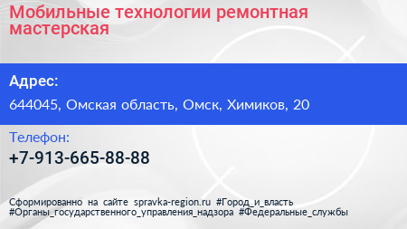 Мобильные технологии, ремонтная мастерская по адресу 644045, Омская область, Омск, Химиков, 20 в дальнейшем Организация, размещена в следующих категориях: