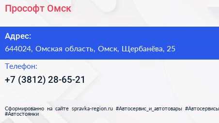 Прософт Омск по адресу 644024, Омская область, Омск, Щербанёва, 25 в дальнейшем Организация, размещена в следующих категориях: