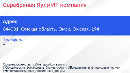 Серебряная Пуля, ИТ-компания по адресу 644031, Омская область, Омск, Омская, 194 в дальнейшем Организация, размещена в следующих категориях: