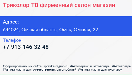 Триколор ТВ, фирменный салон-магазин по адресу 644024, Омская область, Омск, Омская, 22 в дальнейшем Организация, размещена в следующих категориях: