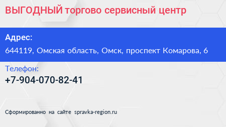 ВЫГОДНЫЙ, торгово-сервисный центр по адресу 644119, Омская область, Омск, проспект Комарова, 6 в дальнейшем Организация, размещена в следующих категориях: