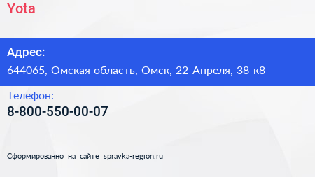 Yota по адресу 644065, Омская область, Омск, 22 Апреля, 38 к8 в дальнейшем Организация, размещена в следующих категориях: