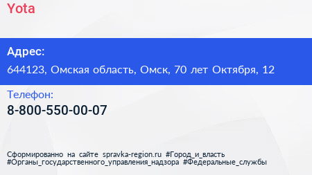Yota по адресу 644123, Омская область, Омск, 70 лет Октября, 12 в дальнейшем Организация, размещена в следующих категориях: