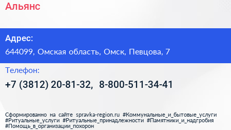 Альянс по адресу 644099, Омская область, Омск, Певцова, 7 в дальнейшем Организация, размещена в следующих категориях: