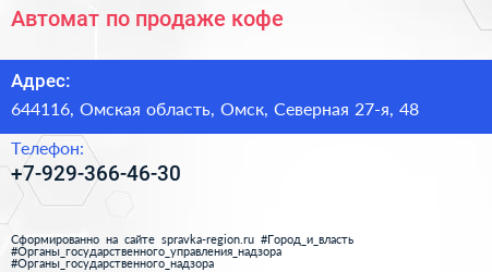Автомат по продаже кофе по адресу 644116, Омская область, Омск, Северная 27-я, 48 в дальнейшем Организация, размещена в следующих категориях: