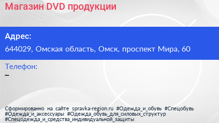 Магазин DVD продукции по адресу 644029, Омская область, Омск, проспект Мира, 60 в дальнейшем Организация, размещена в следующих категориях: