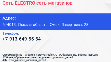 Сеть ELECTRO, сеть магазинов по адресу 644013, Омская область, Омск, Завертяева, 28 в дальнейшем Организация, размещена в следующих категориях: