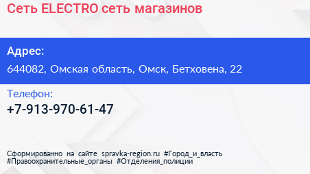 Сеть ELECTRO, сеть магазинов по адресу 644082, Омская область, Омск, Бетховена, 22 в дальнейшем Организация, размещена в следующих категориях: