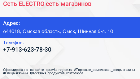 Сеть ELECTRO, сеть магазинов по адресу 644018, Омская область, Омск, Шинная 6-я, 10 в дальнейшем Организация, размещена в следующих категориях: