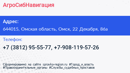 АгроСибНавигация по адресу 644015, Омская область, Омск, 22 Декабря, 86а в дальнейшем Организация, размещена в следующих категориях: