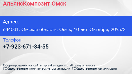 АльянсКомпозит Омск по адресу 644031, Омская область, Омск, 10 лет Октября, 209а/2 в дальнейшем Организация, размещена в следующих категориях: