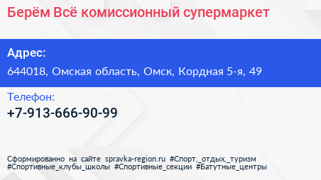 Берём Всё, комиссионный супермаркет по адресу 644018, Омская область, Омск, Кордная 5-я, 49 в дальнейшем Организация, размещена в следующих категориях: