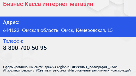 Бизнес-Касса, интернет-магазин по адресу 644122, Омская область, Омск, Кемеровская, 15 в дальнейшем Организация, размещена в следующих категориях: