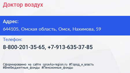 Доктор воздух по адресу 644105, Омская область, Омск, Нахимова, 59 в дальнейшем Организация, размещена в следующих категориях: