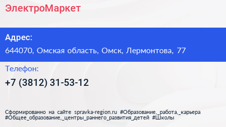 ЭлектроМаркет по адресу 644070, Омская область, Омск, Лермонтова, 77 в дальнейшем Организация, размещена в следующих категориях: