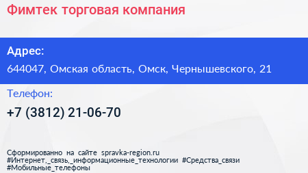 Фимтек, торговая компания по адресу 644047, Омская область, Омск, Чернышевского, 21 в дальнейшем Организация, размещена в следующих категориях: