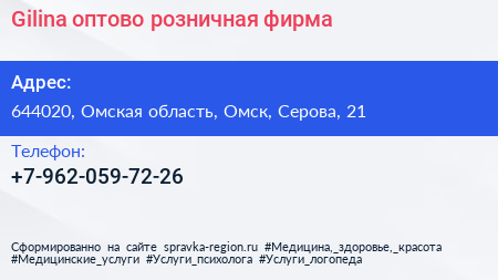 Gilina, оптово-розничная фирма по адресу 644020, Омская область, Омск, Серова, 21 в дальнейшем Организация, размещена в следующих категориях: