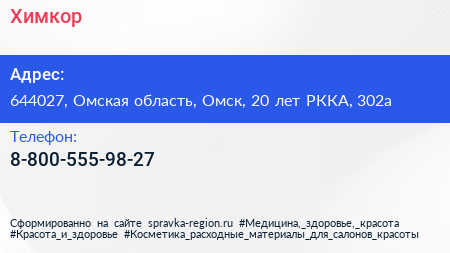 Химкор по адресу 644027, Омская область, Омск, 20 лет РККА, 302а в дальнейшем Организация, размещена в следующих категориях: