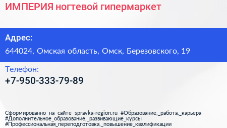 ИМПЕРИЯ, ногтевой гипермаркет по адресу 644024, Омская область, Омск, Березовского, 19 в дальнейшем Организация, размещена в следующих категориях: