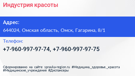 Индустрия красоты по адресу 644024, Омская область, Омск, Гагарина, 8/1 в дальнейшем Организация, размещена в следующих категориях: