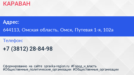 КАРАВАН по адресу 644113, Омская область, Омск, Путевая 1-я, 102а в дальнейшем Организация, размещена в следующих категориях: