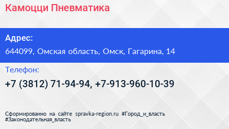 Камоцци Пневматика по адресу 644099, Омская область, Омск, Гагарина, 14 в дальнейшем Организация, размещена в следующих категориях: