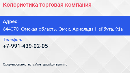 Колористика, торговая компания по адресу 644070, Омская область, Омск, Арнольда Нейбута, 91а в дальнейшем Организация, размещена в следующих категориях: