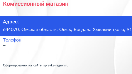 Комиссионный магазин по адресу 644070, Омская область, Омск, Богдана Хмельницкого, 91 в дальнейшем Организация, размещена в следующих категориях:
