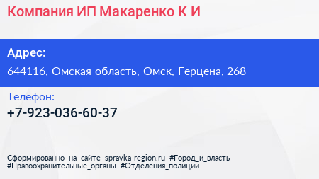 Компания, ИП Макаренко К.И. по адресу 644116, Омская область, Омск, Герцена, 268 в дальнейшем Организация, размещена в следующих категориях: