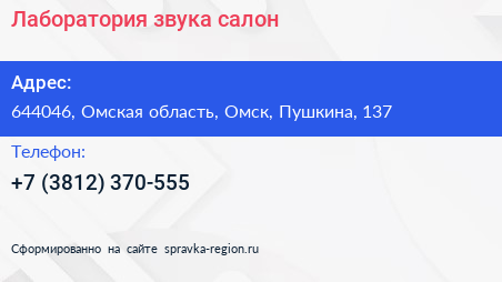 Лаборатория звука, салон по адресу 644046, Омская область, Омск, Пушкина, 137 в дальнейшем Организация, размещена в следующих категориях: