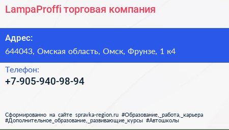 LampaProffi, торговая компания по адресу 644043, Омская область, Омск, Фрунзе, 1 к4 в дальнейшем Организация, размещена в следующих категориях: