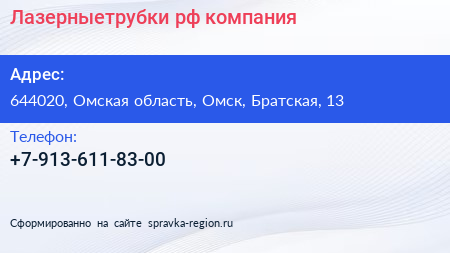Лазерныетрубки.рф, компания по адресу 644020, Омская область, Омск, Братская, 13 в дальнейшем Организация, размещена в следующих категориях: