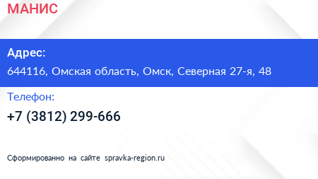 МАНИС по адресу 644116, Омская область, Омск, Северная 27-я, 48 в дальнейшем Организация, размещена в следующих категориях: