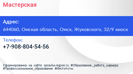 Мастерская по адресу 644060, Омская область, Омск, Жуковского, 32/9 киоск в дальнейшем Организация, размещена в следующих категориях: