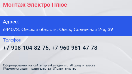 Монтаж Электро Плюс по адресу 644073, Омская область, Омск, Солнечная 2-я, 39 в дальнейшем Организация, размещена в следующих категориях: