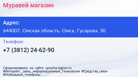 Муравей, магазин по адресу 644007, Омская область, Омск, Гусарова, 30 в дальнейшем Организация, размещена в следующих категориях: