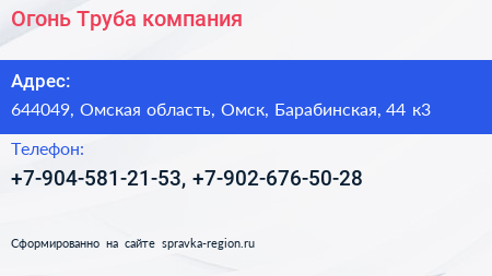 Огонь Труба, компания по адресу 644049, Омская область, Омск, Барабинская, 44 к3 в дальнейшем Организация, размещена в следующих категориях: