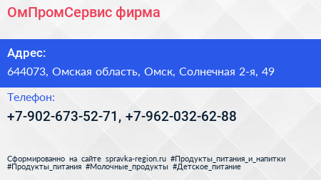 ОмПромСервис, фирма по адресу 644073, Омская область, Омск, Солнечная 2-я, 49 в дальнейшем Организация, размещена в следующих категориях:
