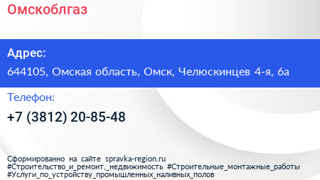Омскоблгаз по адресу 644105, Омская область, Омск, Челюскинцев 4-я, 6а в дальнейшем Организация, размещена в следующих категориях: