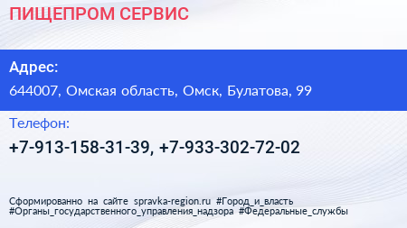 ПИЩЕПРОМ СЕРВИС по адресу 644007, Омская область, Омск, Булатова, 99 в дальнейшем Организация, размещена в следующих категориях: