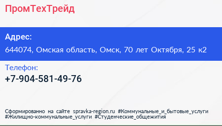 ПромТехТрейд по адресу 644074, Омская область, Омск, 70 лет Октября, 25 к2 в дальнейшем Организация, размещена в следующих категориях: