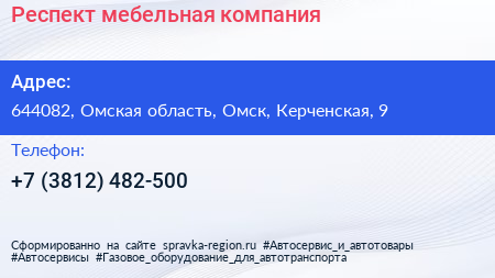 Респект, мебельная компания по адресу 644082, Омская область, Омск, Керченская, 9 в дальнейшем Организация, размещена в следующих категориях: