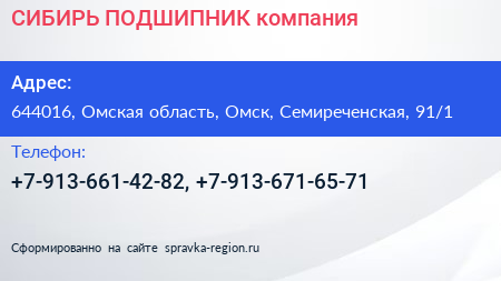СИБИРЬ ПОДШИПНИК, компания по адресу 644016, Омская область, Омск, Семиреченская, 91/1 в дальнейшем Организация, размещена в следующих категориях: