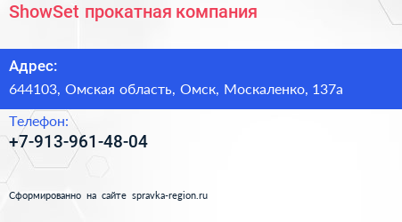 ShowSet, прокатная компания по адресу 644103, Омская область, Омск, Москаленко, 137а в дальнейшем Организация, размещена в следующих категориях: