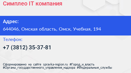 Симплео, IT-компания по адресу 644046, Омская область, Омск, Учебная, 194 в дальнейшем Организация, размещена в следующих категориях: