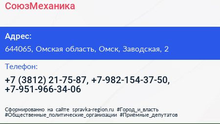 СоюзМеханика по адресу 644065, Омская область, Омск, Заводская, 2 в дальнейшем Организация, размещена в следующих категориях:
