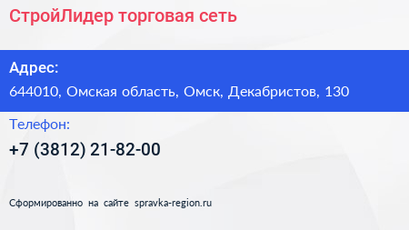 СтройЛидер, торговая сеть по адресу 644010, Омская область, Омск, Декабристов, 130 в дальнейшем Организация, размещена в следующих категориях:
