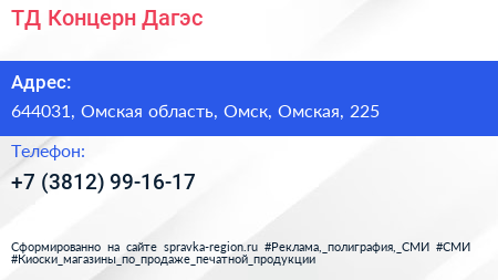 ТД Концерн Дагэс по адресу 644031, Омская область, Омск, Омская, 225 в дальнейшем Организация, размещена в следующих категориях: